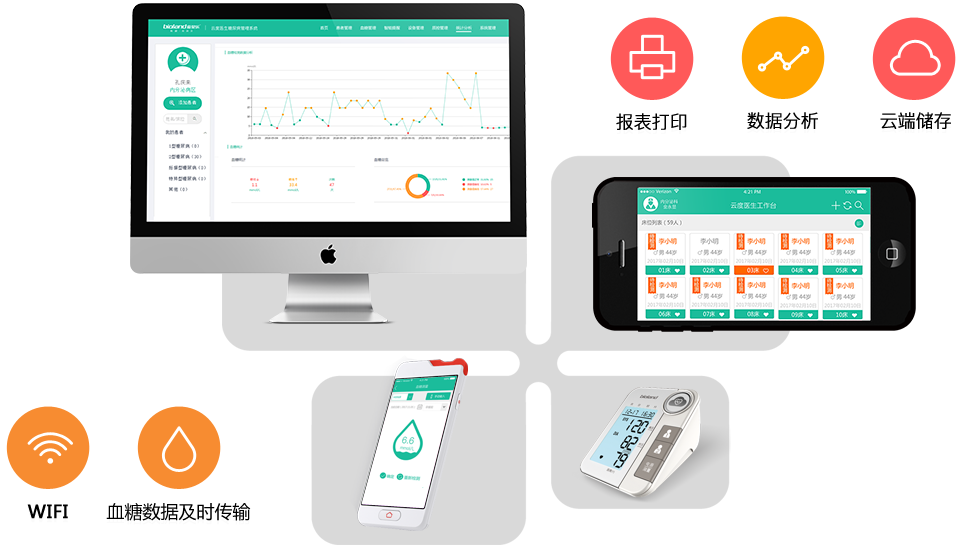 通过智能云平台+智能设备+智能APP,优化POCT检测流程,实现血糖、血压等慢病监测指标数据的智能上传、永久储存,多维度统计分析等,整合患者院内院外全病程的监测数据和医患资源,为护士、医生、患者,医疗机构搭建新型的慢病管理桥梁,为广大慢病患者提供更完善的健康解决方案。